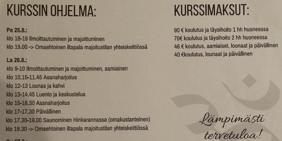 KURSSI PERUTTU VÄHÄISEN OSALLISTUJAMÄÄRÄN VUOKSI Yhdistyksen alkuajoista asti järjestetty Joutsenon viikonloppu Joutsenon Opistolla 26.-27.8.2017. Joutsenon opistolla järjestetävällä joogan viikonloppukurssilla hiljennytään oman mielen äärelle ja tehdään monipuolisia asanaharjoituksia. Kurssin opettajana toimii joogaohjaaja Sirpa Polo. Osallistujilla on mahdollisuus ruokailla ja majoittua Joutsenon opistolla. Kurssin hinta alkaen 40 €. Lisätietoja, tarkempi aikataulu ja ilmoittautumiset 4.8.2017 mennessä Joutsenon Opistolle… Read More Joutsenon viikonloppu – KURSSI PERUTTU